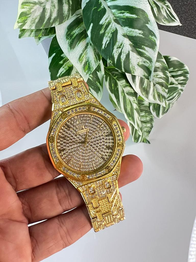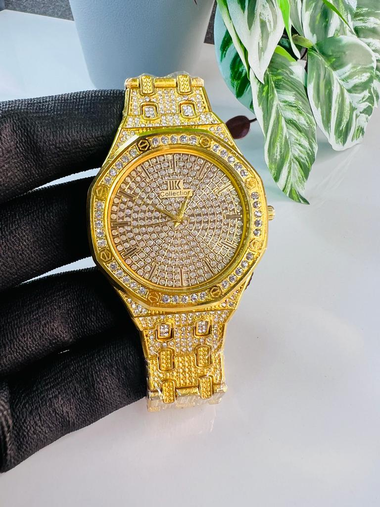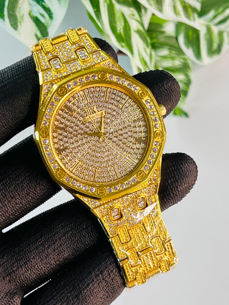 Gold Round Dial Stone Embedded Analog Watch For Men