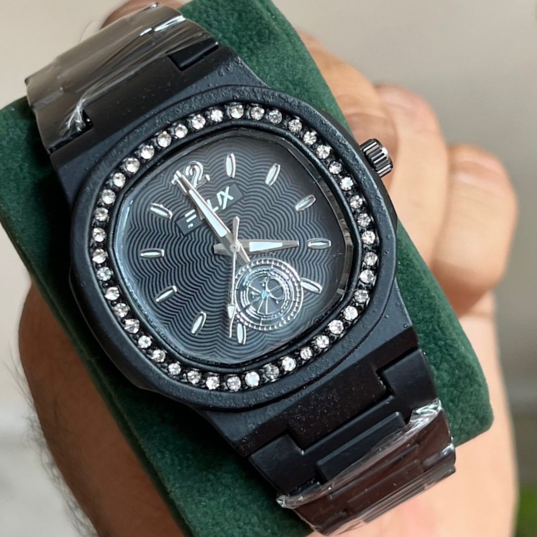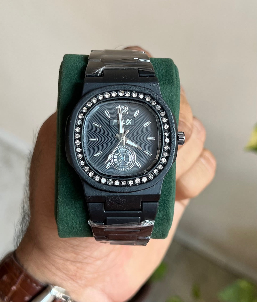 Black Round Dial Stone Embedded Classsic Watch For Men